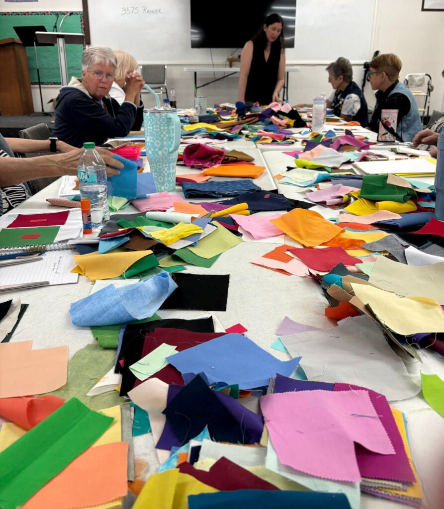 Christy Bess showed some of her collage quilts (images below) on February 6, 2025 and taught a class after the meeting on that day and the following day.